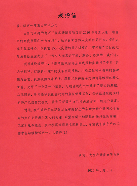 繼2023年商河三發(fā)名著清園一期項目獲建設(shè)單位表揚后,近日,建設(shè)單位商河三發(fā)房地產(chǎn)開發(fā)有限公司再次向我公司發(fā)來表揚信,對我公司第五項目